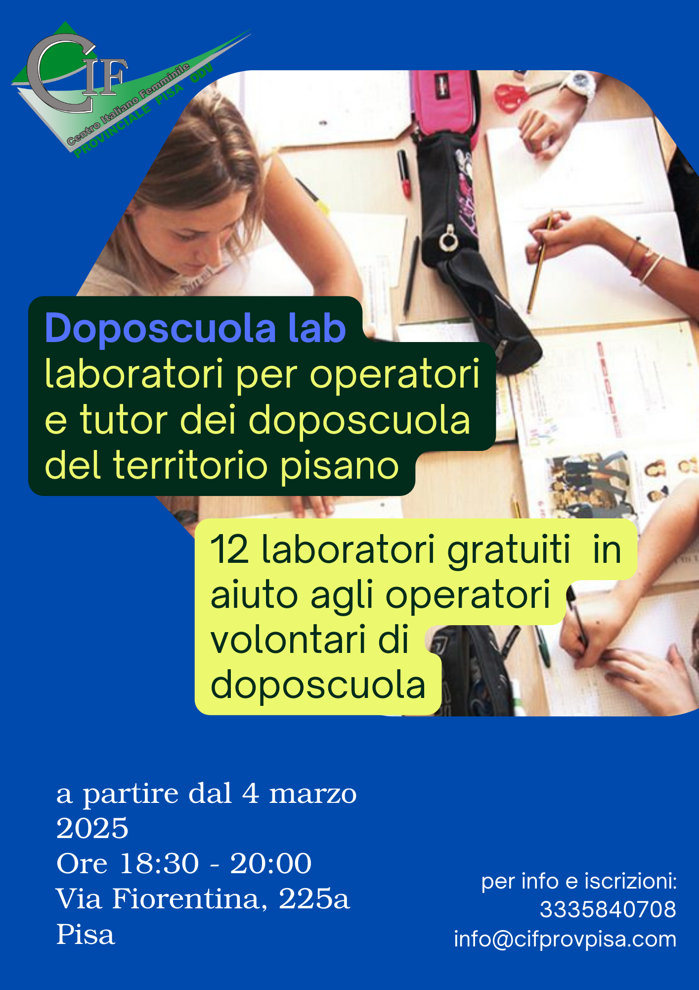 DOPOSCUOLA LAB 12 laboratori gratuiti rivolti ad operatori di doposcuola a partire dal 4 marzo dalle ore 18:30 alle 20:00 in Via Fiorentina, 225a a Pisa. Per info e iscrizioni: 3335840708 infoòcifprovpisa.com