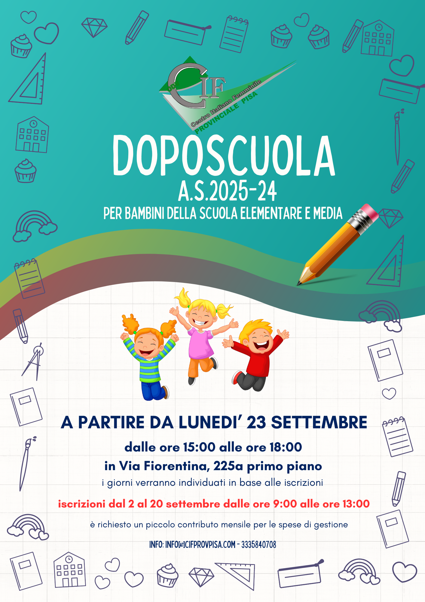 Nell’ambito del Progetto “Connessioni Comuni” finanziato dal Comune di Pisa il 29 settembre prenderà il via il servizio di doposcuola gestito dal Cif Provinciale di Pisa odv. Il doposcuola si trova in Via Fiorentina, 225a a Pisa ed è aperto tutti i pomeriggi dalle ore 15:00 alle ore 18:00 dal lunedì al venerdì. Per info e iscrizioni la segreteria è aperta dal 22 al 26 settembre dalle ore 15:00 alle ore 18:00.