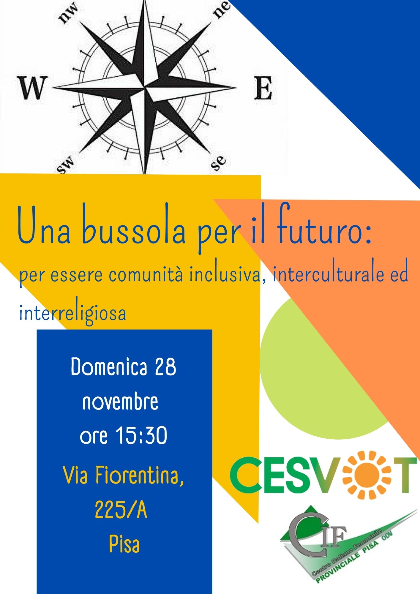 “Una bussola per il futuro: per essere comunità inclusiva, interculturale ed interreligiosa” convegno realizzato in collaborazione con Cesvot in programma domenica 28 dalle ore 15:30 presso la nuova sede Cif in Via Fiorentina, 225/a a Pisa.