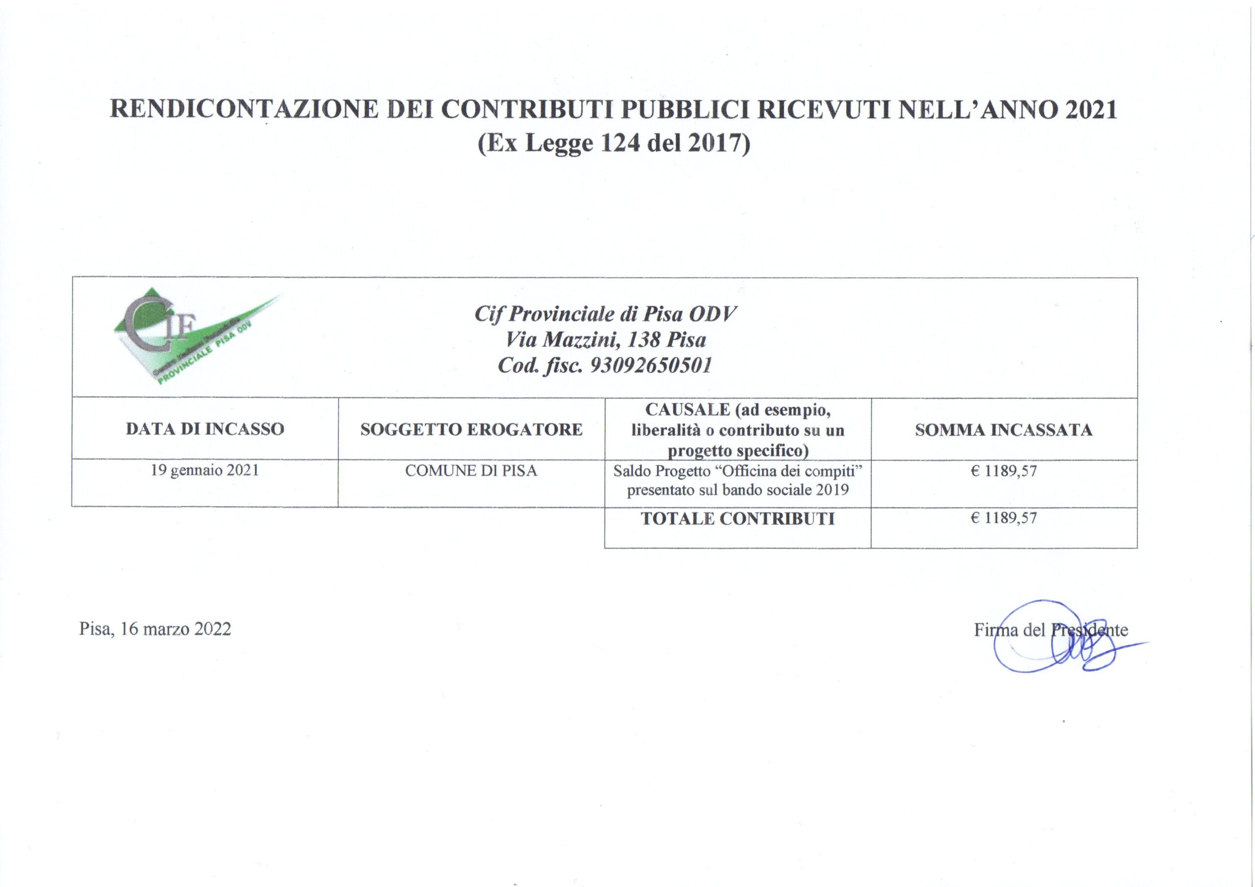 CONTRIBUTI PUBBLICI RICEVUTI NELL’ANNO 2021
